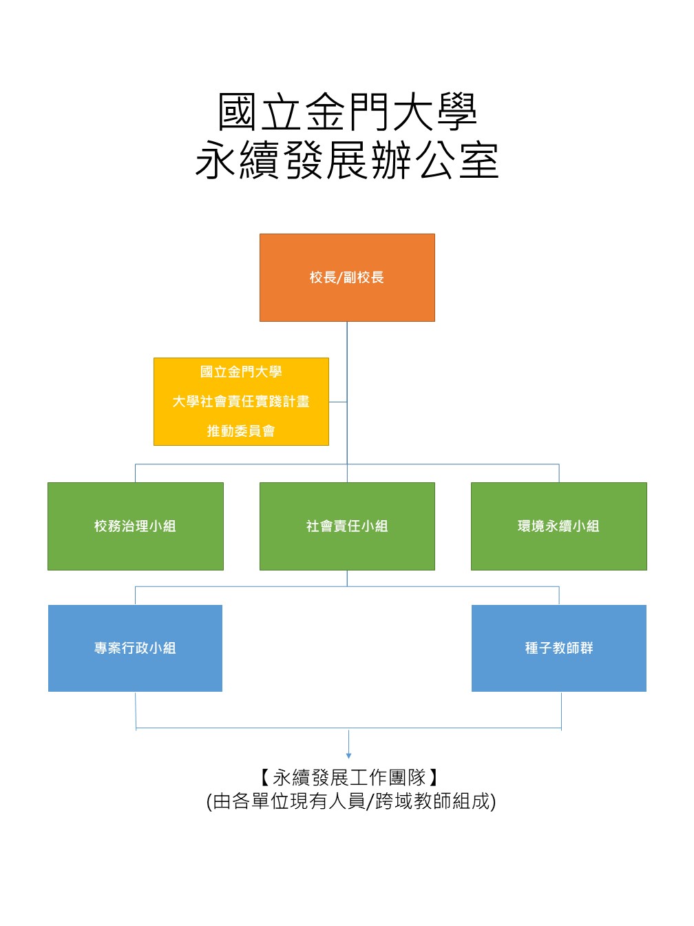 本校為永續推動大學社會責任,落實永續校園社會實踐,於112學年度訂定「國立金門大學永續發展辦公室設置要點」•成立「永續發展辦公室」•由校長或是副校長擔任主任,設校務治理小組、社會責任小組及環境永續小組,各置小組組長一人,委員組成為校內一級行政主管及具備社會實踐與地方創生經驗者。並得置專案工作人員、研究人員或兼任研究 助理若干人。本委員工作重點如下: