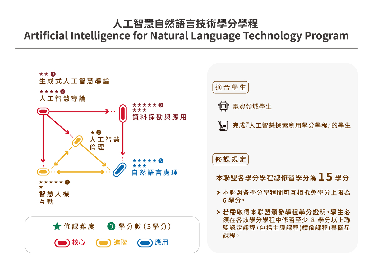- 學生修滿單項學分學程規定之學分與科目者,經本校人工智慧學程聯盟校內學程委員會複審後,得依本校學分學程申請流程,發給修畢證明。若需取得本聯盟頒發學程學分證明,學生必須在各該學分學程中修習至少8學分以上聯盟認定課程,包括主導課程(鏡像課程)與衛星課程。